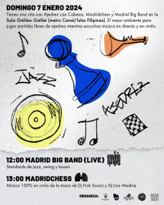 ¡Reservad la fecha! El día 7 de enero a las 12:00h del mediodía, Jazz, ajedrez y vermut en la Sala Galileo Galilei de Madrid (c/ Galileo). Tenéis una cita con Ajedrez con cabeza, la Madrid Big Band y MadridChessClan. Partidas libres de ajedrez mientras escuchas música en directo y en vinilo. Aquí os dejamos el enlace para reservar las entradas, que están volando. La entrada es gratuita para los menores de edad acompañados.